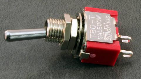 Small SPST toggle switch useful for connecting battery packs or making controls.