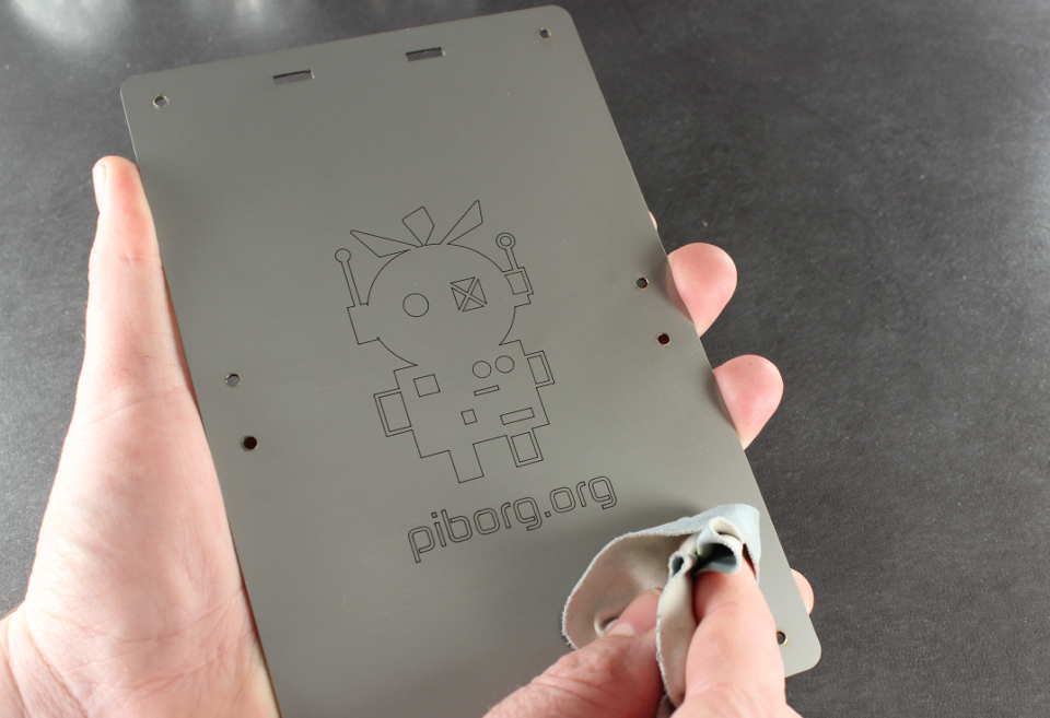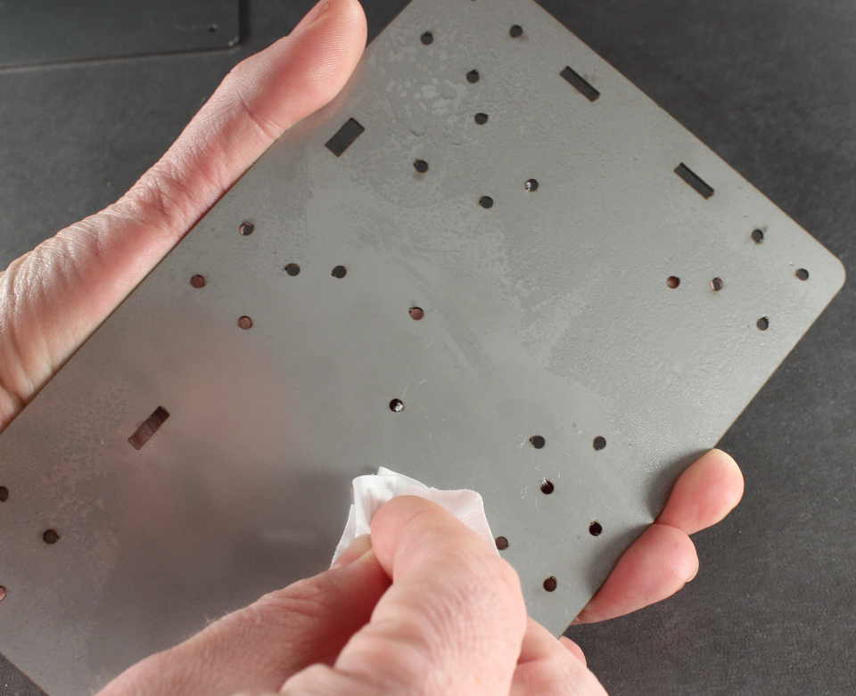 The Stainless Steel top and bottom are laser cut, and are covered with a protective oil, which you can remove with IPA or stainless cleaner. The Kit includes a small towell which is ideal for wiping the steel clean.