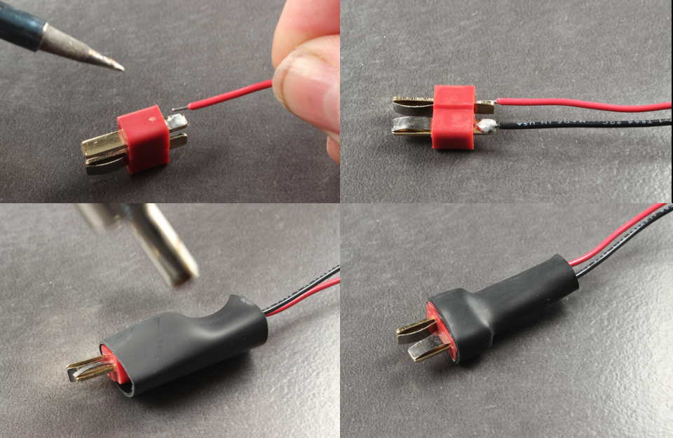 Take one of the 30mm pieces of heatshrink and place it over the soldered plug. Align it so it is flush with the front of the deans plug. Preferably use a hot air blower, or heat from a safe distance from a lighter flame, or radiated heat from a soldering iron to shrink the heatshrink as shown in the last picture.