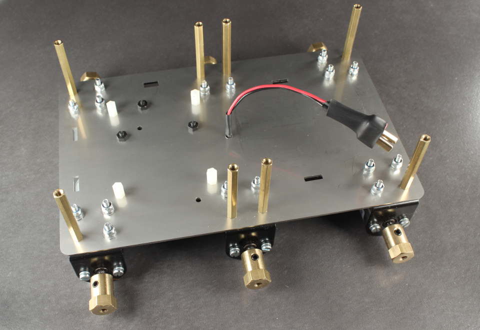 Do the same for the middle motor mount, with the exception that there are two [M3x40 Brass post]s, on the two holes towards the outside edge of the Steel Plate. Again, the posts have a spring washer only on one side.