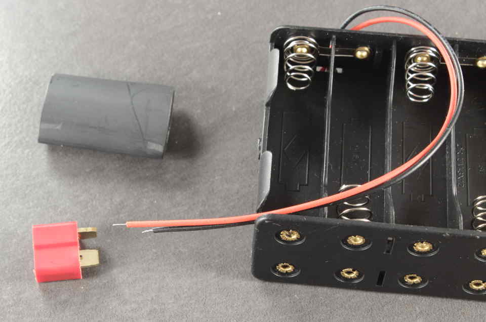 Solder the female deans plug connector to the 12xAA battery pack. Again, Red to +, Black to -. Place heatshrink over the connector and set aside for later.