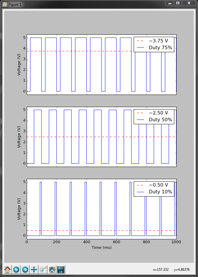 The ratio between the high and low states is usually expressed as a percentage of how much time the pin is set to the high state for, this is known as the duty cycle.