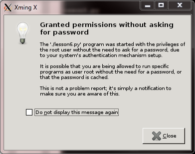gksudo ./lesson6.pygksudo is similar to sudo, but it also allows access to drawing things on the screen.