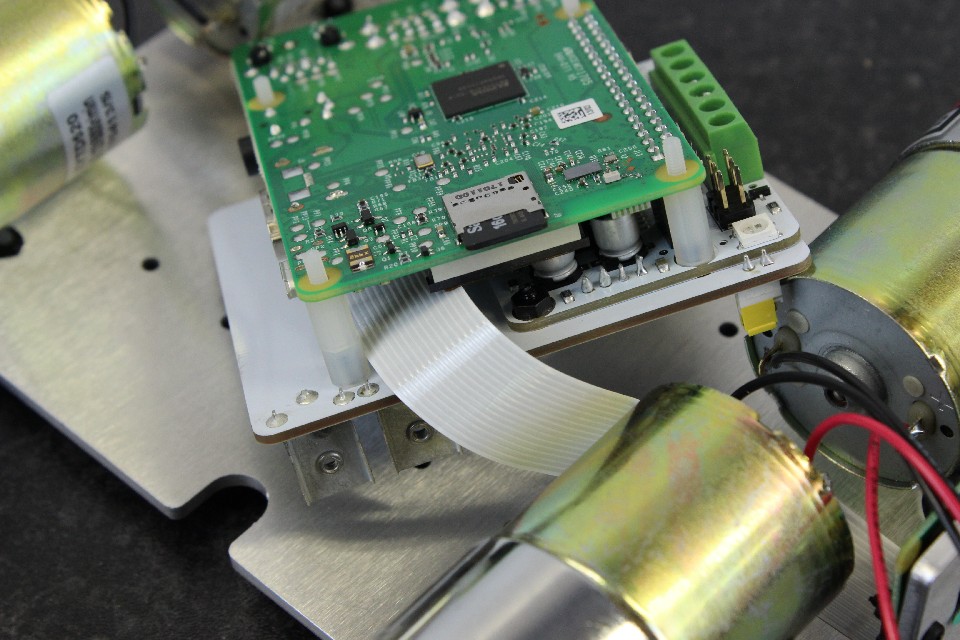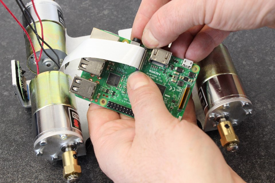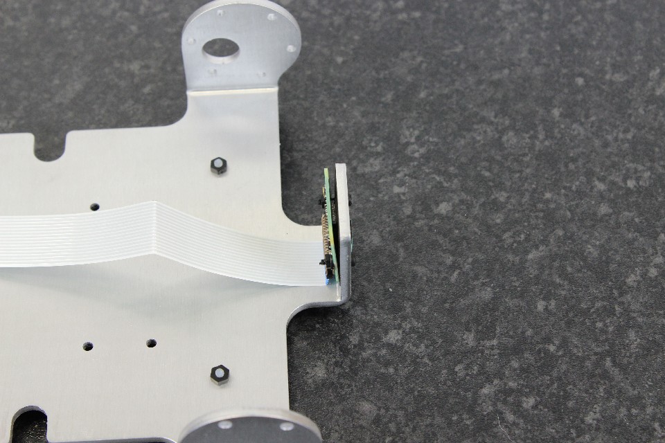 Step 11: Place the camera in the camera slot of the MonsterBorg chassis with the cable oriented towards the chassis. Add the [M2 screw], nut and washer. The screw should come from the front of the robot with the washer and nut behind the camera.