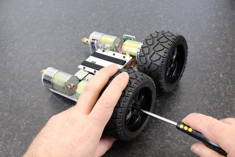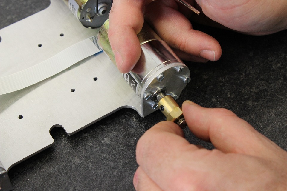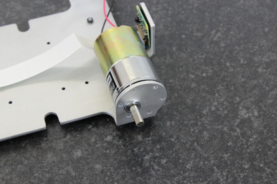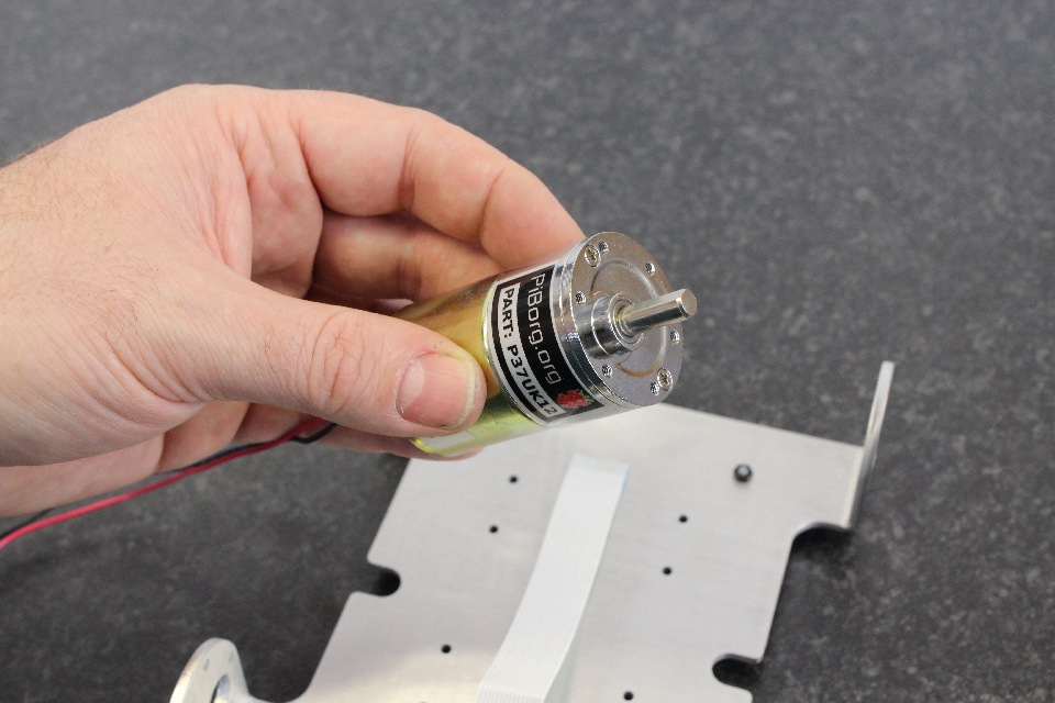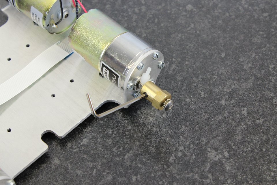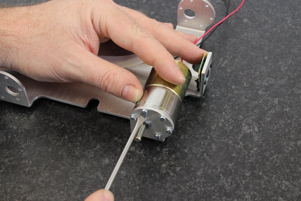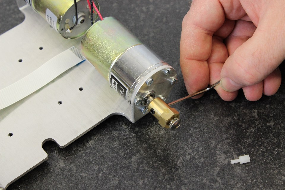 Step 20: The hub should slot over the motor. If it does not, loosen the grub screws. Orient the hub so that the grub screw and the slot in the motor shaft line up.