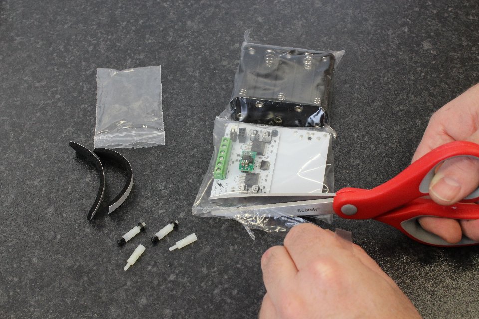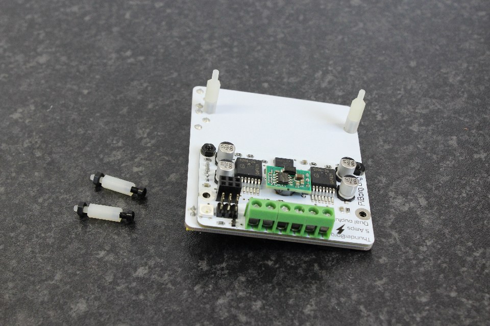 Step 24: Open the bag with the ThunderBorg motor controller. In here are two [M2.5x12 posts] with a screw and nut each, and two pairs of posts (these are actually made up of a [M2.5x8 post] and a [M2.5x6 post].)
