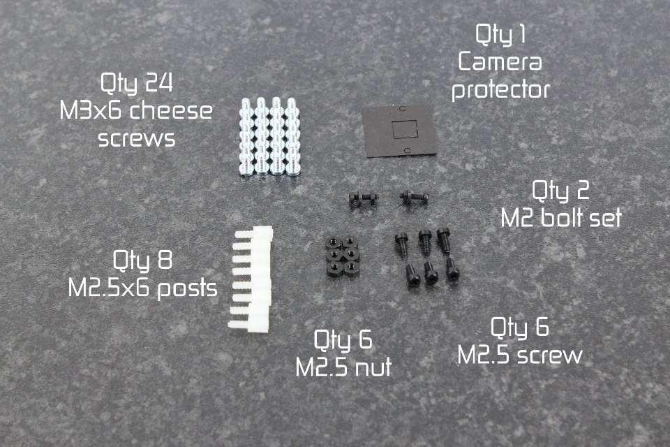 Step 3: The kit should consist of twenty four [M3x6 cheese screws] (top left), eight [M2.5x6 posts], six [M2.5 nuts], six [M2.5x8 nylon screws], two [M2 screws], two [M2 washers], two [M2 posts] and a camera protector.