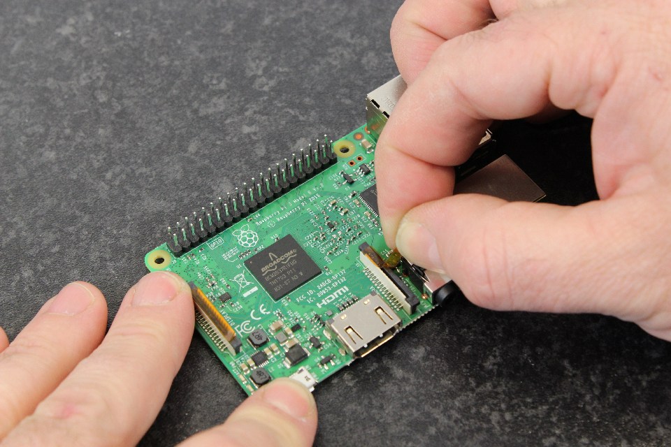 Step 44: Check the camera cable is not pinched, and the 6 pins on the Raspberry Pi are in the female header.