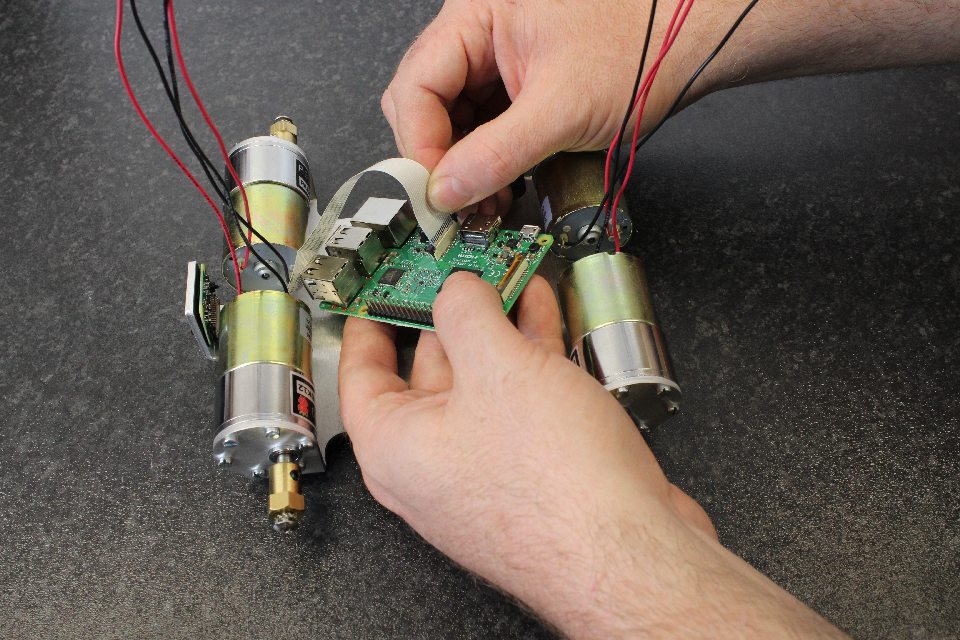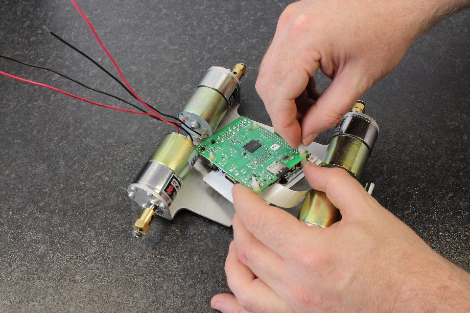 Step 53: Turn the board over carefully while making sure the camera cable doesn't get caught on the motors.