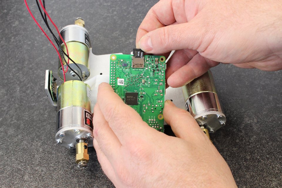 Step 41: Place the SD card with the code from step zero. It should have the connectors towards the Pi as pictured.