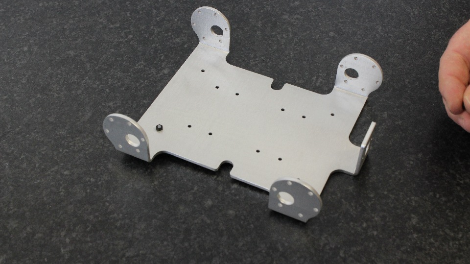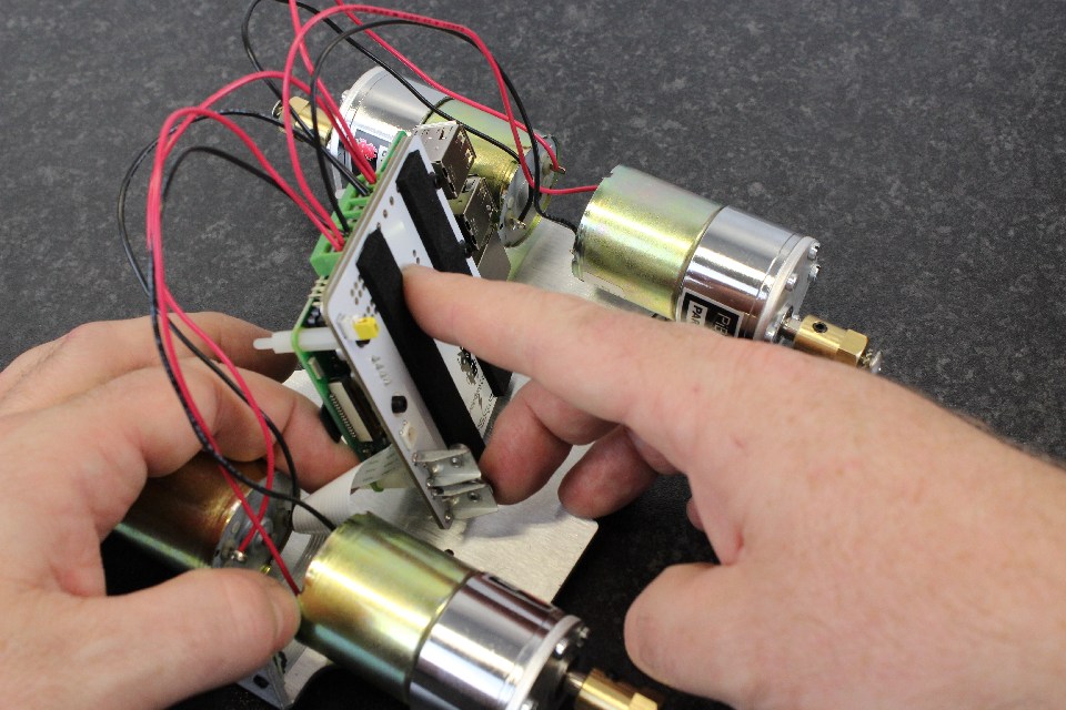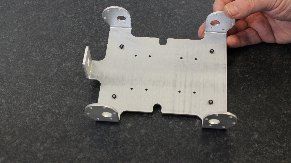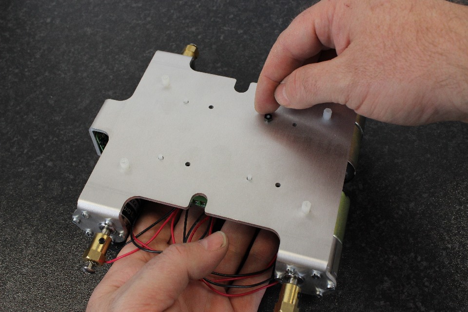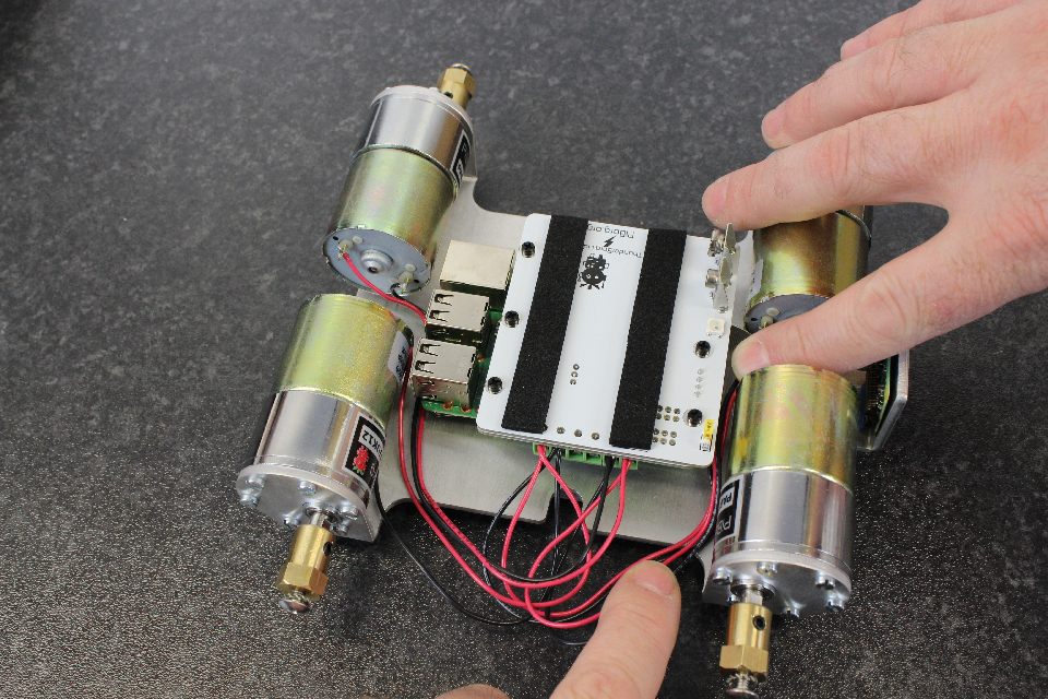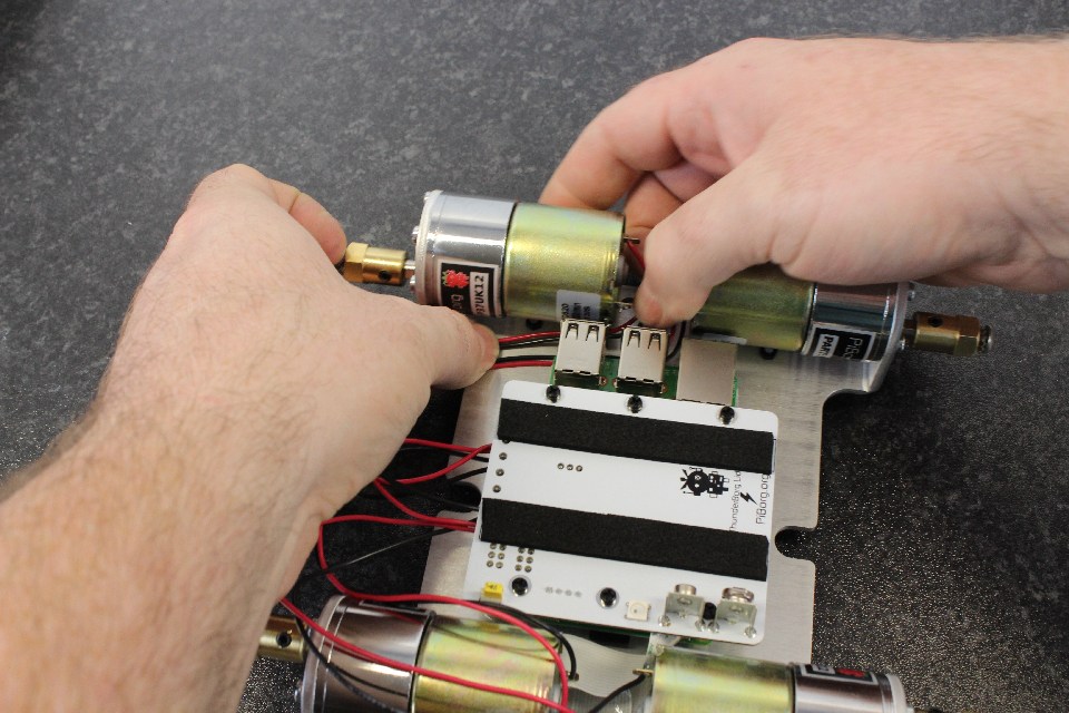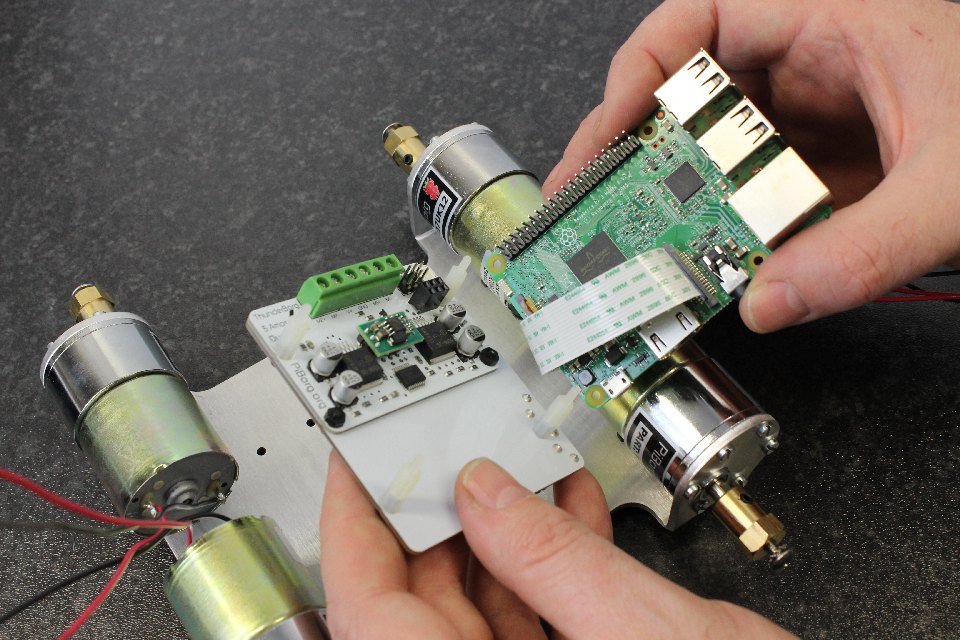 Step 56: Whilst holding the chassis and the ThunderBorg and ThunderBorg Lid, turn over carefully and align the posts so that you can put the M2.5 nuts on the threads.