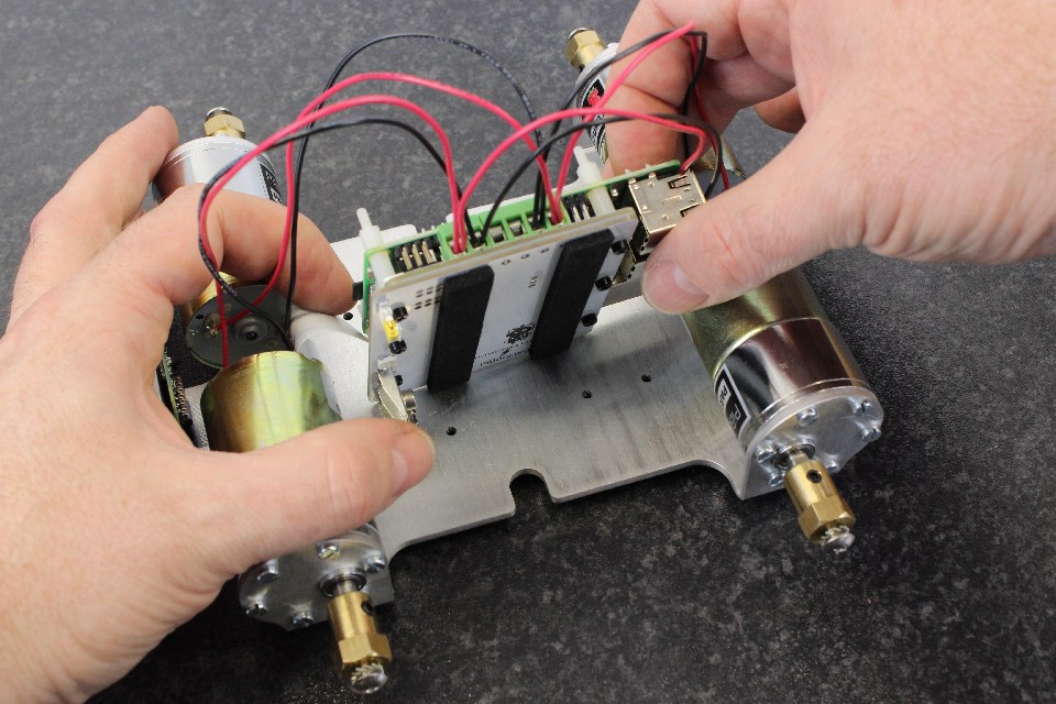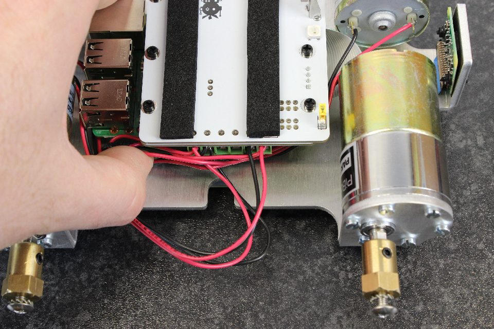 Step 47: Make sure the chassis is oriented as shown. That is, camera to the left. Take the two red wires from the two motors closest to you. Place the ends of the wire in the connector on the far left.