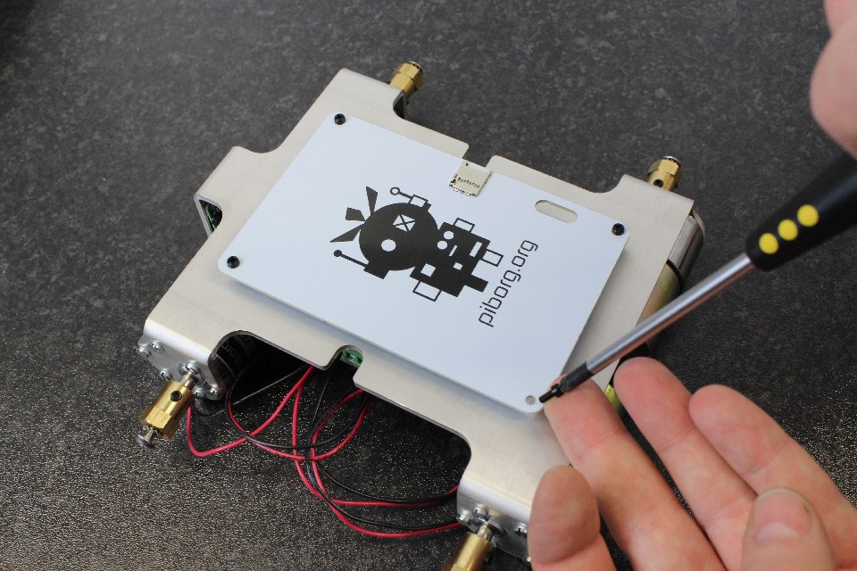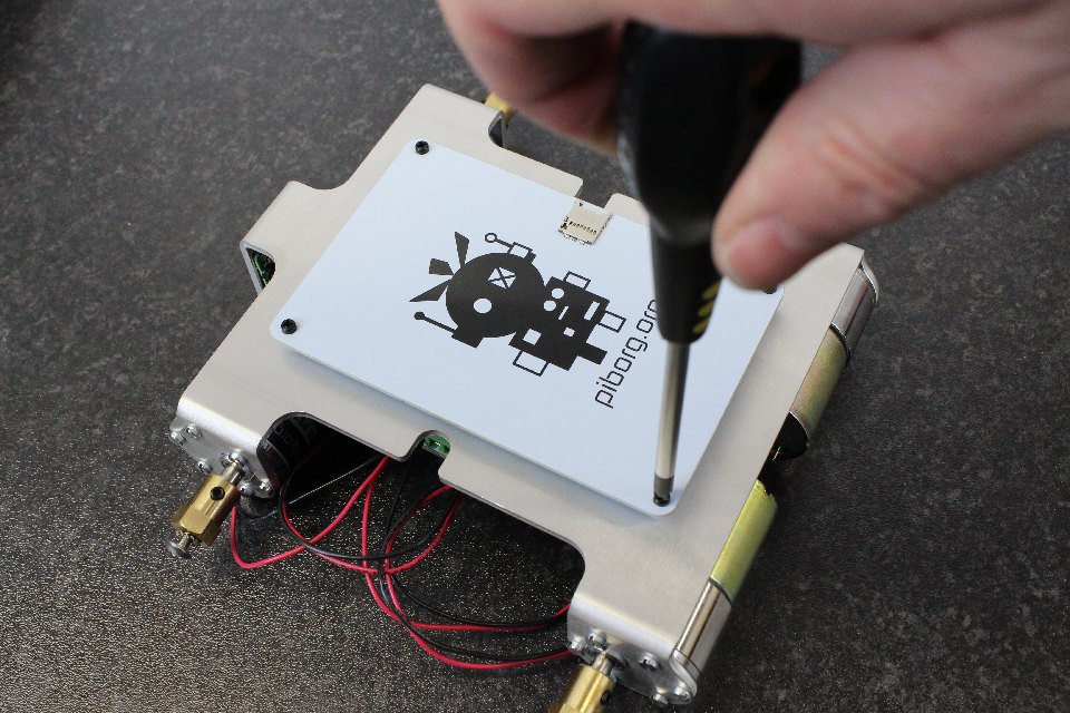 Step 58: Take the Yeti Lid and place on top of the 4 posts. Put four [M2.5x8 nylon screws] in the Yeti Lid. The Yeti Lid can be oriented with the PiBorg logo outside or inside.