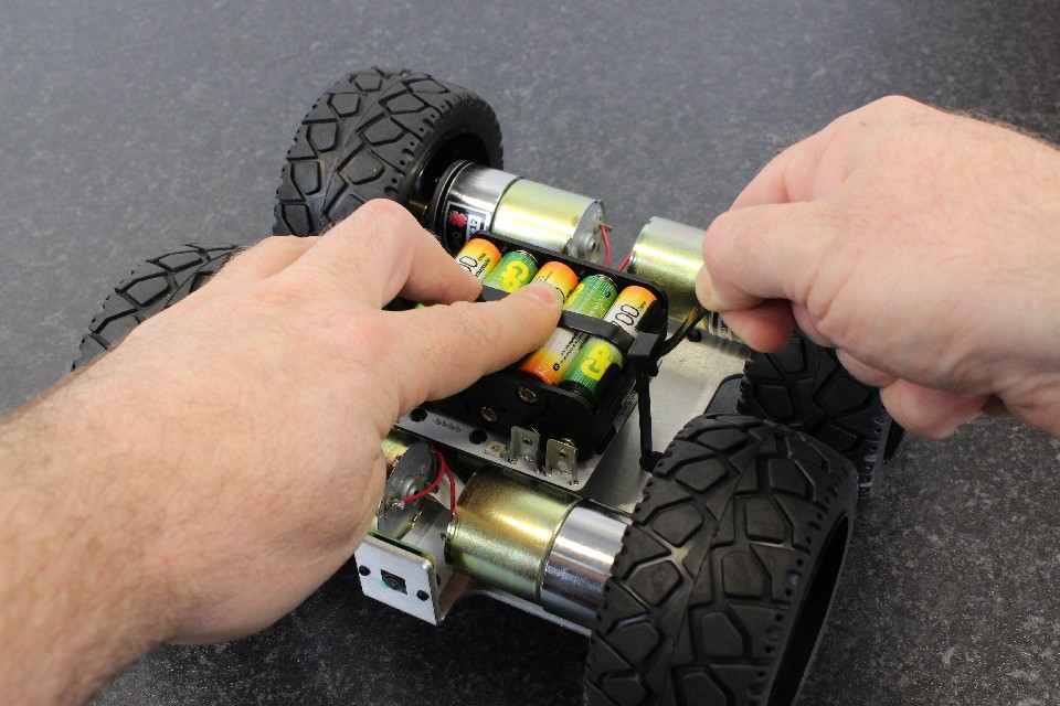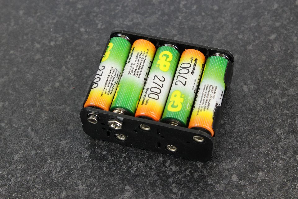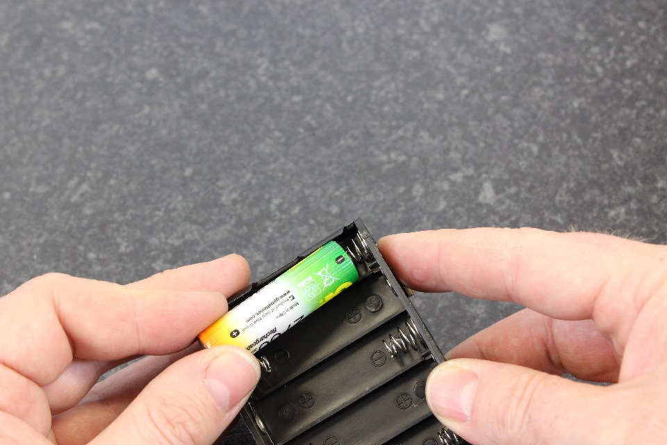 Step 67: Take the battery holder and put in 10x AA batteries (batteries purchased separately and are not part of the kit). Make sure the batteries are correctly orientated. That is the negative to the spring.