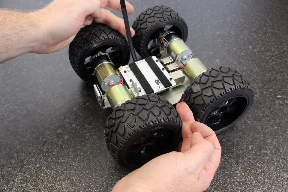 Step 72: When correctly aligned and tight, slide the end part of the cable tie between the battery pack and the ThunderBorg lid.
