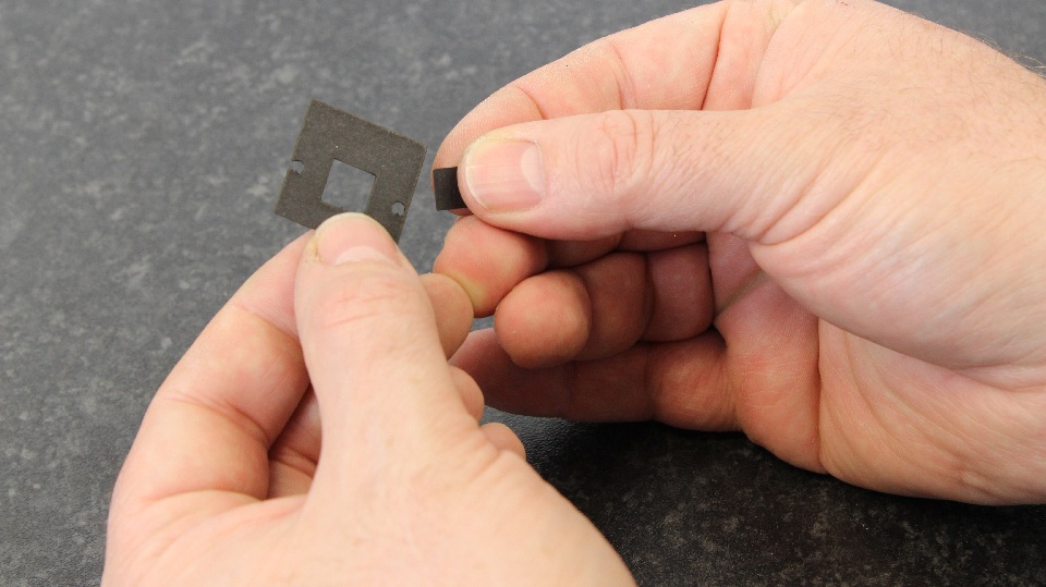 Step 8: Take the camera protector and remove the square tab and two hole tabs. Please note the camera protector can leave black marks so be careful.