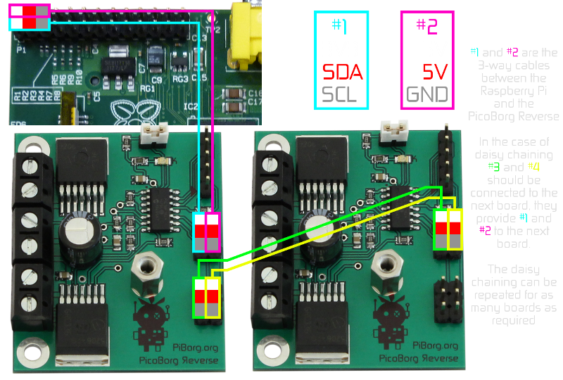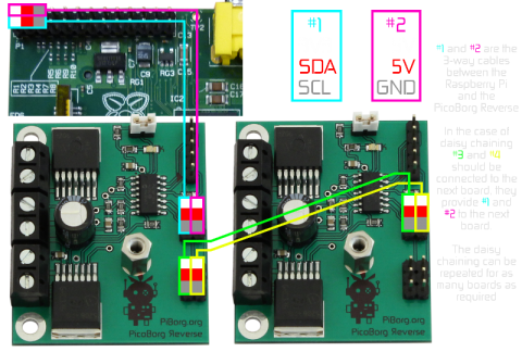 Image #2 below shows what signals are on the 3-pin cables between the PicoBorg Reverse and the Raspberry Pi.