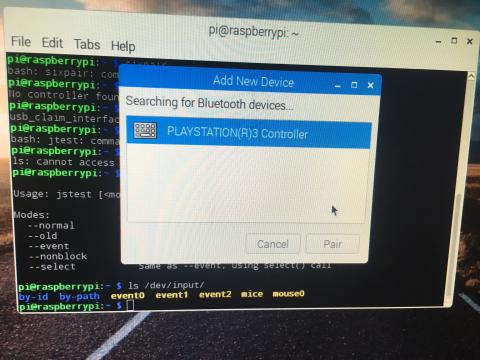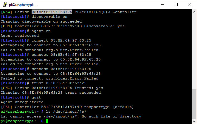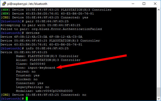pi@PiBorg:~ $ sudo bluetoothctl [NEW] Controller B8:27:EB:16:80:10 PiBorg [default] [NEW] Device 00:06:F5:5D:67:A6 00-06-F5-5D-67-A6 [bluetooth]# devices Device 00:06:F5:5D:67:A6 00-06-F5-5D-67-A6 [bluetooth]# info 00:06:F5:5D:67:A6 Device 00:06:F5:5D:67:A6 Alias: 00-06-F5-5D-67-A6 Class: 0x000508 Icon: input-gaming Paired: no Trusted: yes Blocked: no Connected: yes LegacyPairing: no UUID: Human Interface Device... (00001124-0000-1000-8000-00805f9b34fb) UUID: PnP Information (00001200-0000-1000-8000-00805f9b34fb) Modalias: usb:v054Cp0268d0100 [bluetooth]#I would try removing your PS3 controller: