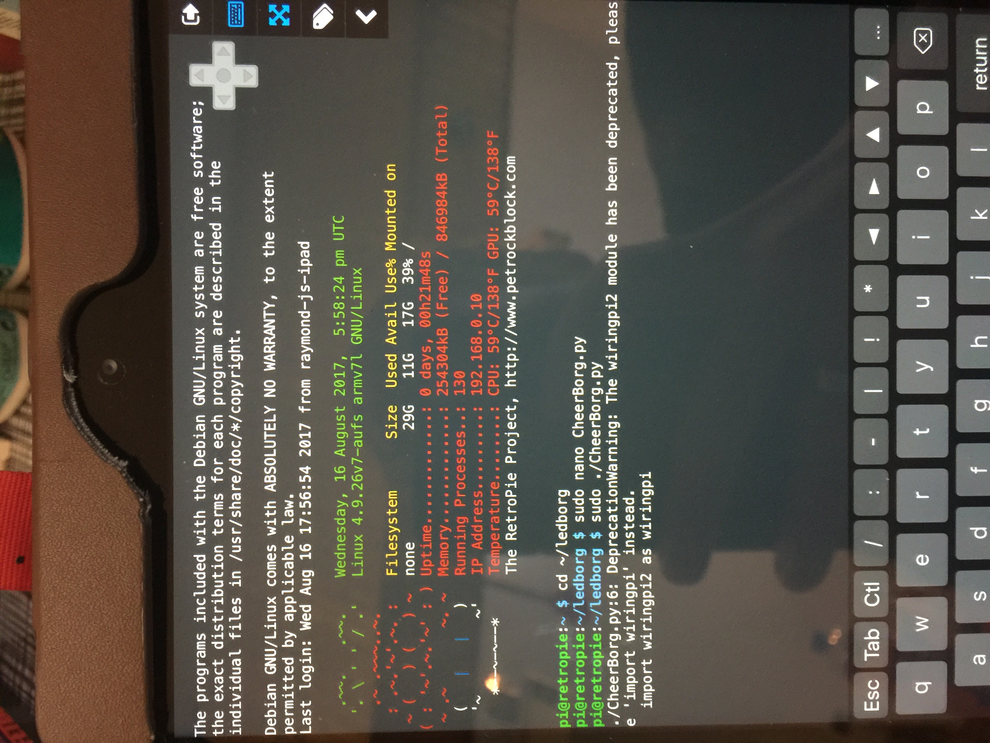 Hi I'm getting this message when starting cheerborg.py from ssh into my pi. It still works but I have to back out of ssh and go back in because it stops me entering any more commands after this message pops up.