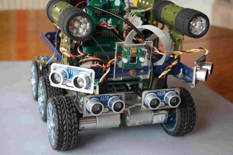 Yes, thanks PiBorg, I remember them now. These are as Diddy is now, it looks pretty much the same but the webcam is now fixed rather than on a servo. The four ultrasonic sensors are now all arrayed on the front rather than two each fore and aft. The Gertboard has gone and I use a stand alone Darlington transistor array to switch the torches on and off.