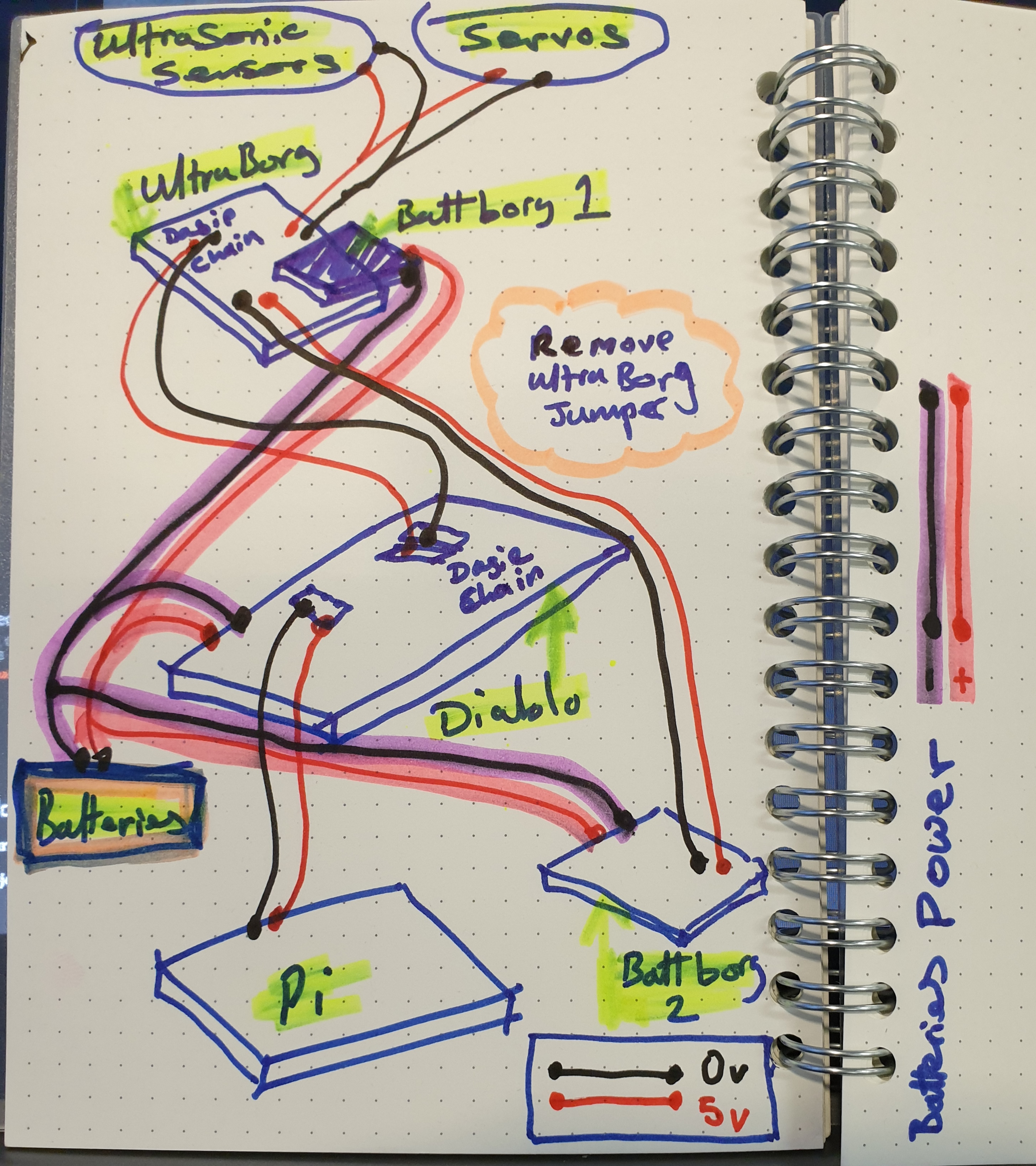 With that arrangement the main BattBorg will power all of the boards and devices connected to the Raspberry Pi. The second BattBorg or UBEC will power the servos and ultrasonic sensors separately. They can both be connected to the same battery pack :)