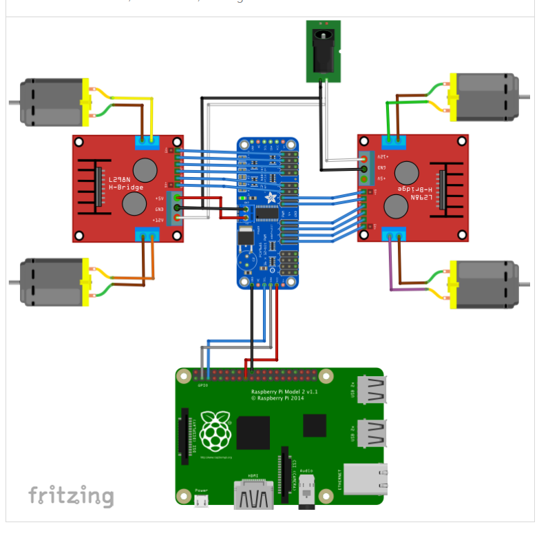 This is my schematic for the electrical components for my all wheel drive robot. does anyone know how to write/find a code to control these 4 motors independently using a transmitter? My goal for this project is to turn the robot by accelerating any tire I choose.