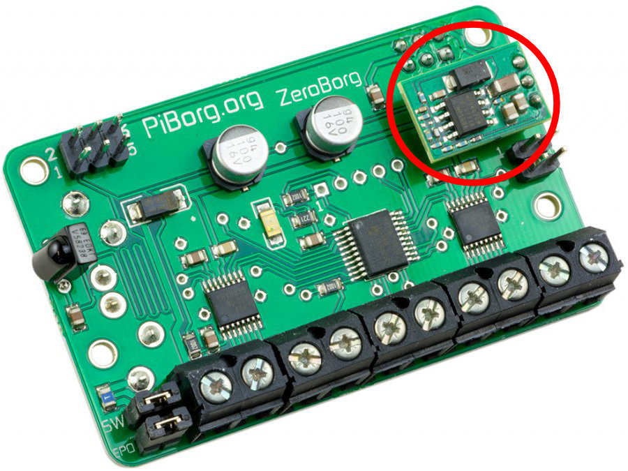 The ZeroBorg Complete has a some extra components, one of which is the 5V regulator used to power the Raspberry Pi directly from the ZeroBorg. This is circled in the image below.