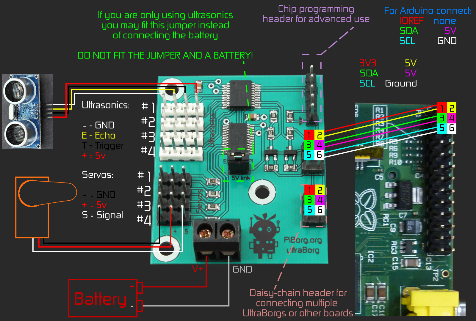 Now, to clarify the second part of my question which you referred to as "a bit confusing" :) The thing is that I know that "UltraBorg is not designed to drive DC motors". I am using it for my drone application where the UltraBorg is assumed to be able to control brushless motors through ESC. I saw a mention on the Raspberry PI forum that UltraBorg can be used for this purpose and I believe before I decided to buy the board, I also checked the PiBorg forum and found somewhere a discussion where the comment was saying that controlling brushless motors speed should be doable using UltraBorg. As you surely know, all that ESCs need to control motor speed is PWM signal. Battery is LiPO package so it is not to be connected to UltraBorg anywhere, UltraBorg must only generate the PWM signal. So, in the diagram you included (which I have found some time ago) where you put the servo in my application goes the ESC. All I need is to know which specific functions to use to generate PWM signal. I believe I can figure this out myself after some research but maybe you already know this so it would save me A LOT of time :)