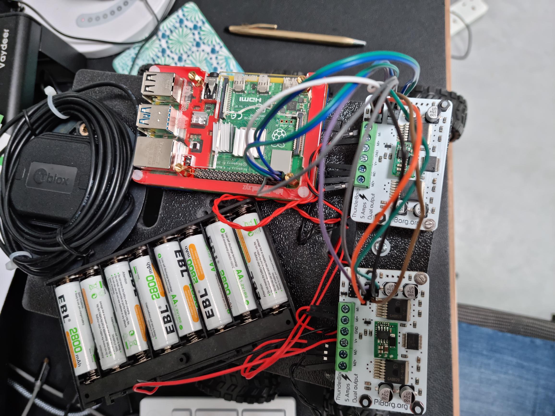 The connections between the ThunderBorgs and to the Pi only carry the lower logic voltages (5V and 3.3V) along with the communications used to control the boards. There is no wire carrying the full battery voltage between the boards.