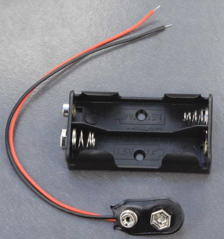 Battery holder for 2x AA batteries, with 9V style connector. Comes with matching 9V connector with wires. Suitable for powering 3V motors with PicoBorg. Not suitable for BattBorg.