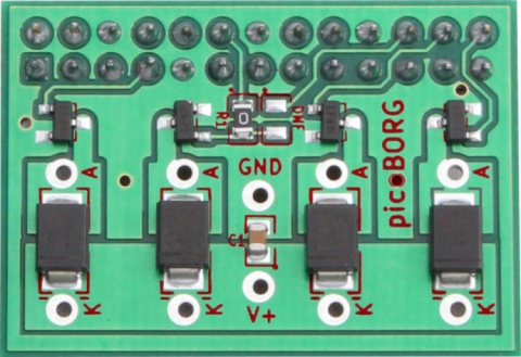With PicoBorg, you can turn on and off up to four fans, motors, solenoids, or relays etc. from your Raspberry Pi.