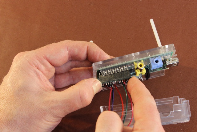 Carefully line up the holes of the PicoBorg socket with the expansion header of the Raspberry Pi and push down on the edges of the PicoBorg to fit. Be careful to push from the edges of the board as the soldered pins can be a bit sharp!