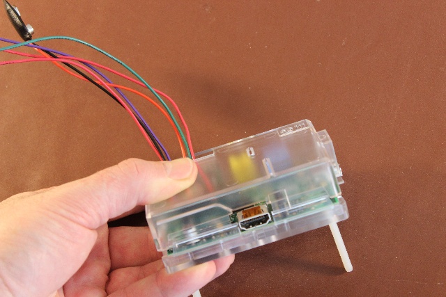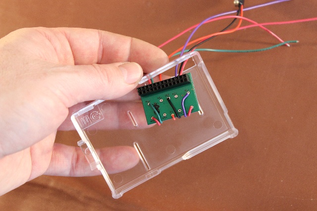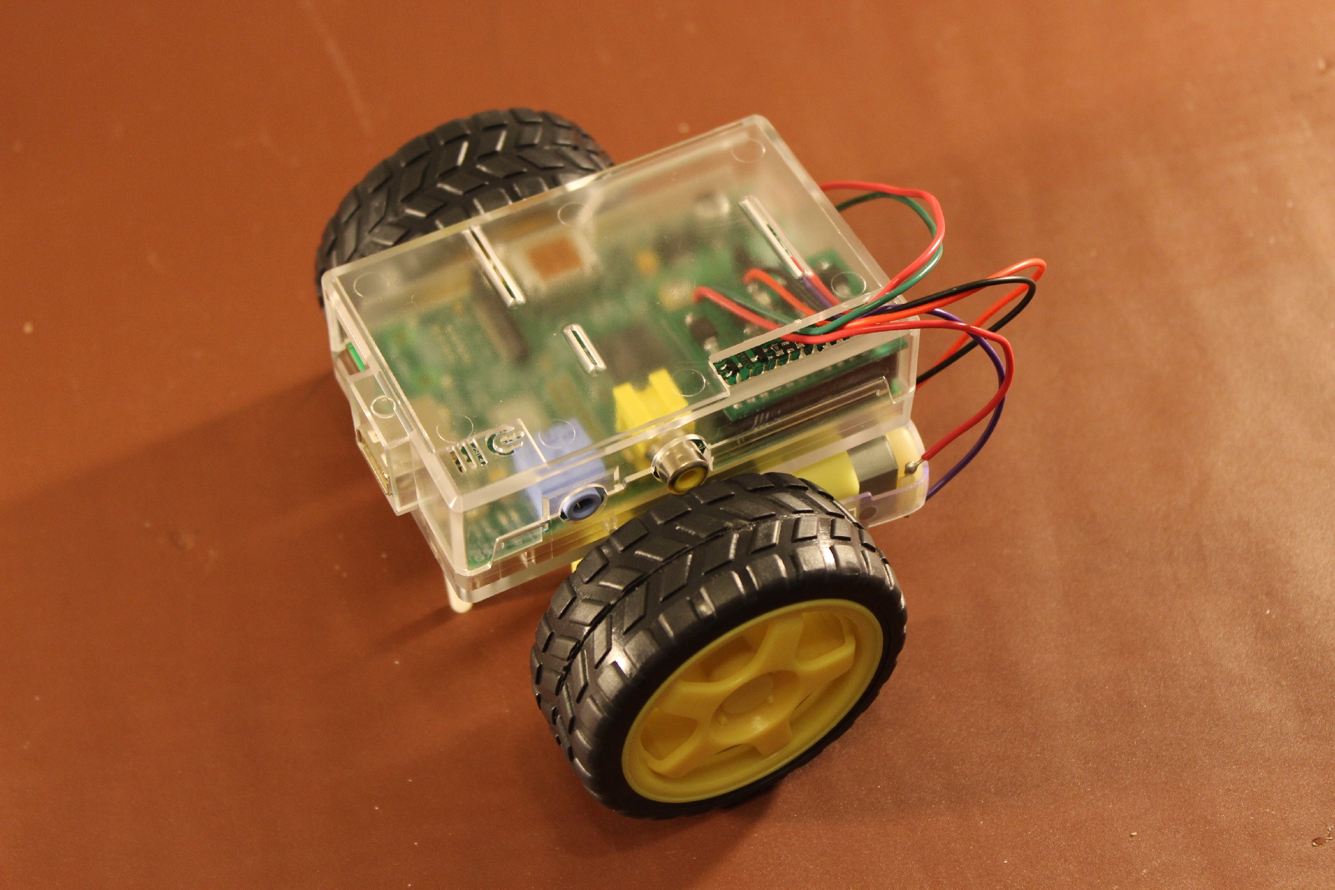 Route the cables to the motors. Red should be closest to the case on both motors. Make sure you leave room for the Raspberry Pi’s SD card and USB power cable.