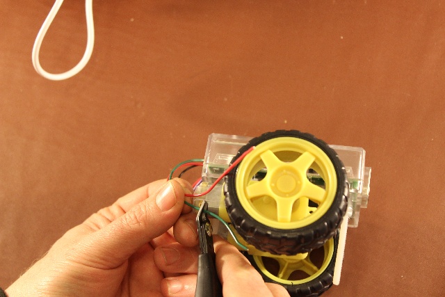 Strip a small amount of cable from the wires to solder to and carefully solder the wires to the motors. Remember red is towards top of case.