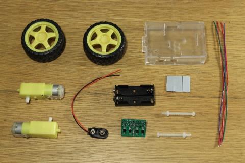 Includes a Raspberry Pi case, Motors, Wheels, Battery holder, screws, wires, adhesive tape and a PicoBorg.