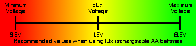 For a 10x rechargeable AA battery pack we find a range of 9.5 to 13.5 V works well: