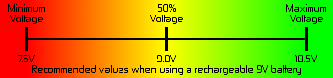 For a 9V rechargeable battery we find a range of 7.5 to 10.5 V works well: