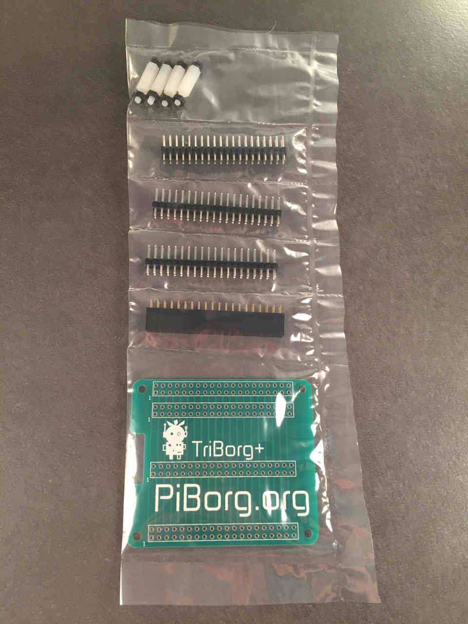 Ready to solder - this includes the TriBorg+ PCB, three 2x20 pin male headers and one 2x20 female header.