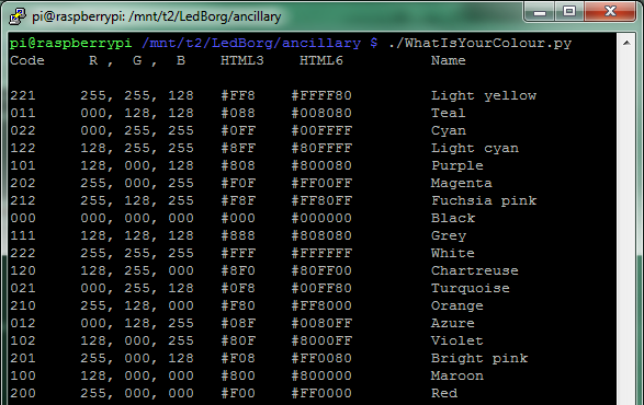 So you have been playing with some code, and your LedBorg is showing a colour that you like, how would you find out what the colour is called, an HTML colour code, or even just the LedBorg colour code number?